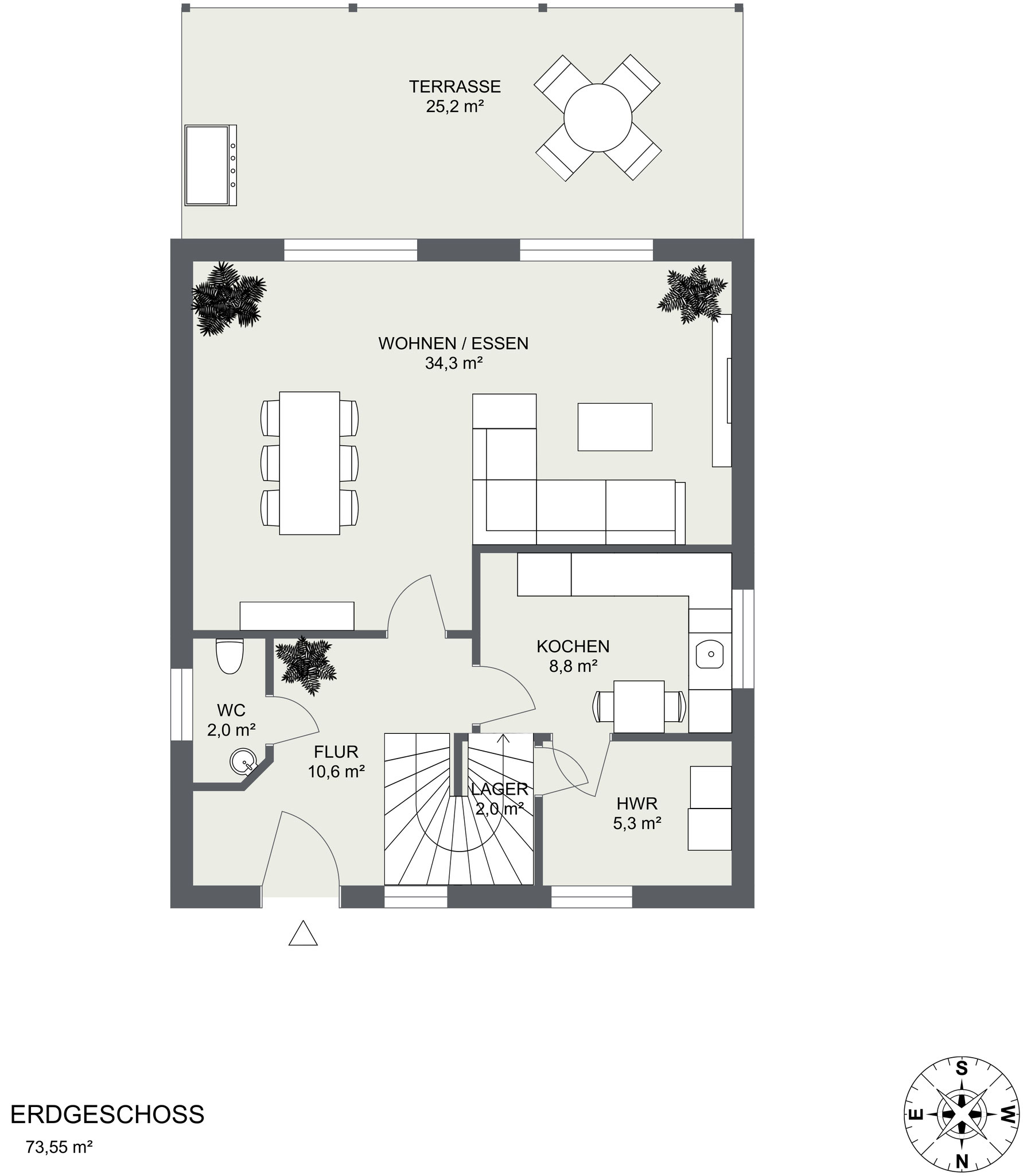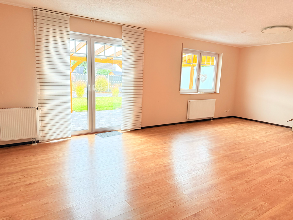 Der großzügige Wohn- und Essbereich mit über 34 m² bildet das Herzstück des Hauses. Große Fenster sorgen für viel Tageslicht und bieten einen schönen Blick in den pflegeleichten Garten. Von hier aus gelangen Sie auf die großzügige, überdachte Terrasse, die fast ebenso viel Platz bietet wie der Wohnbereich.