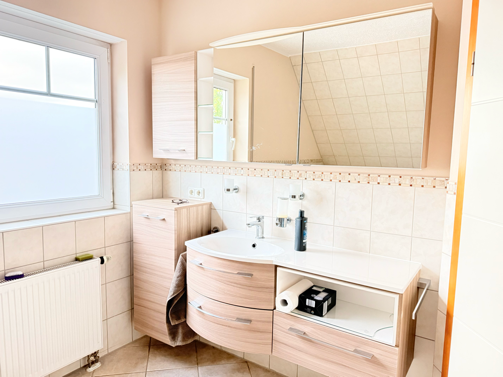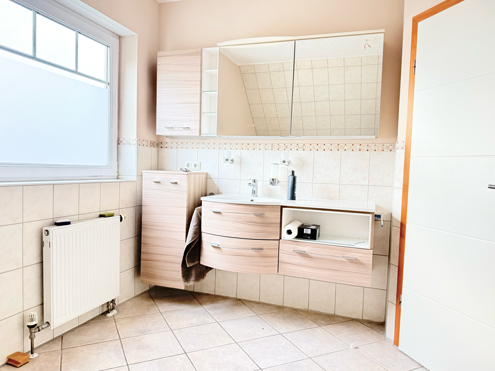 Das große Badezimmer überzeugt durch seine zeitlose Gestaltung mit hellen, weißen Fliesen und einer komfortablen Ausstattung: Eine Badewanne, eine separate Dusche, ein Doppelwaschtisch sowie ein WC bieten hier alles, was man für den Familienalltag braucht. Die hochwertigen Badmöbel sind bereits im Kaufpreis enthalten und runden das gepflegte Gesamtbild ab.