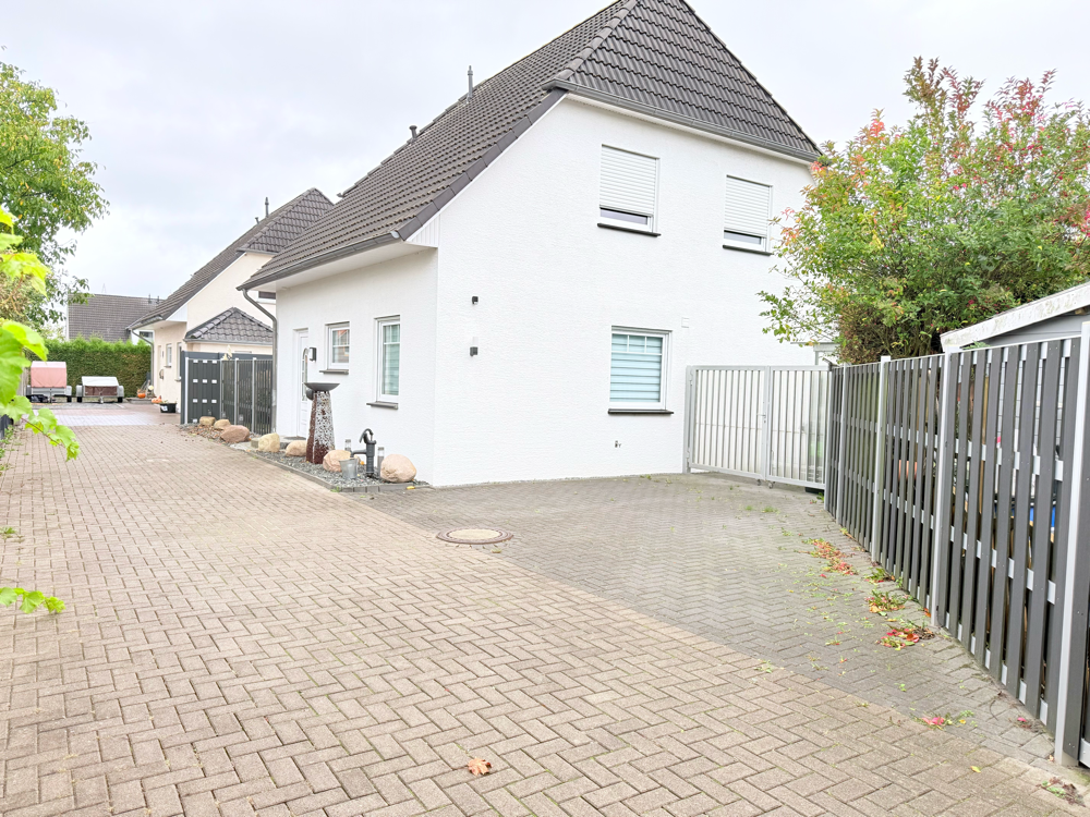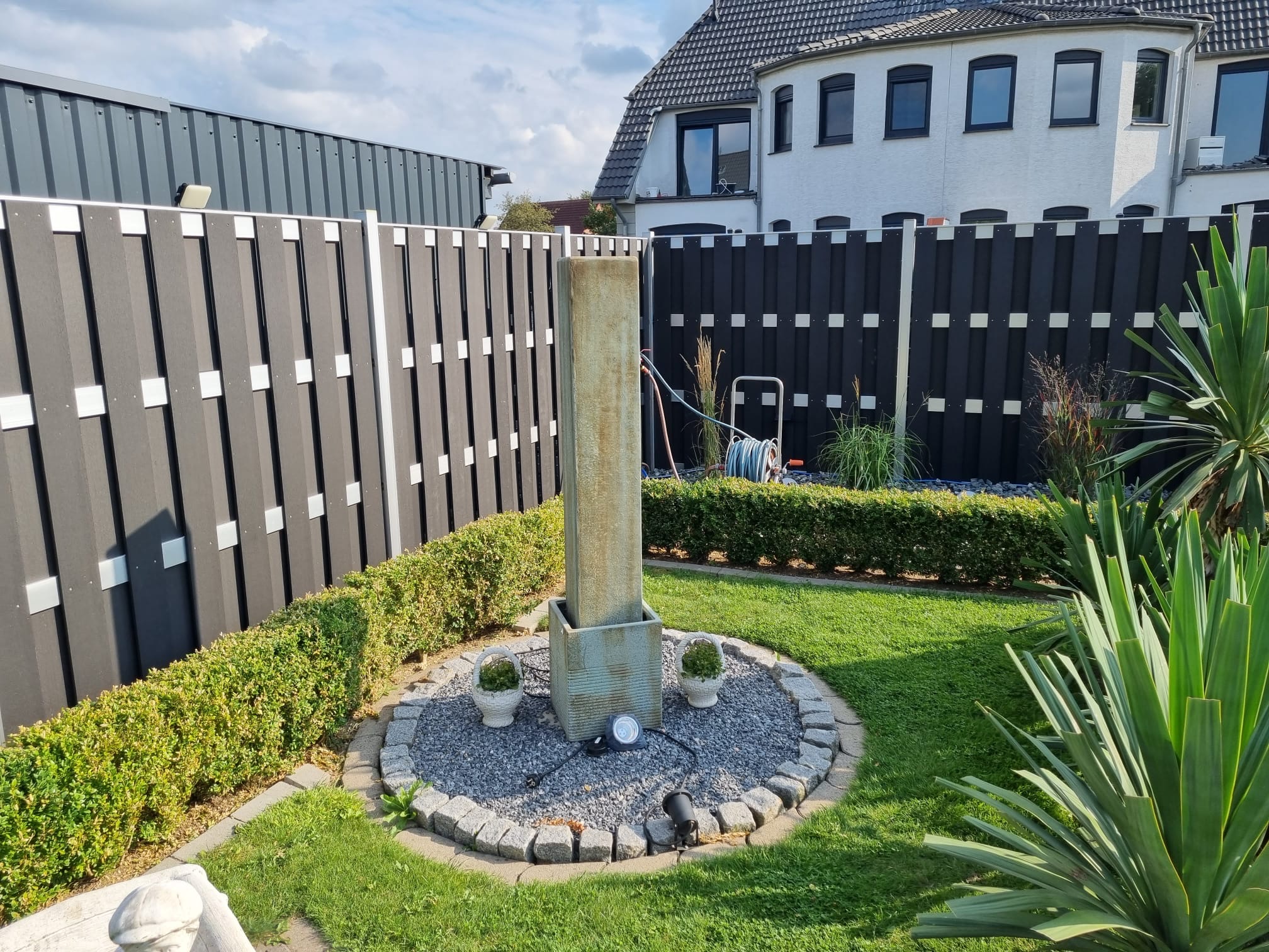Eine geschmackvoll angelegte Feuerstelle sorgt für eine besonders gemütliche Atmosphäre an lauen Sommerabenden. Das komplette Grundstück ist mit einem 1,80 m hohen WPC-Alu-Verbundzaun eingefriedet. Dieser ist pflegeleicht, langlebig und blickdicht, was sowohl Privatsphäre als auch Sicherheit gewährleistet.