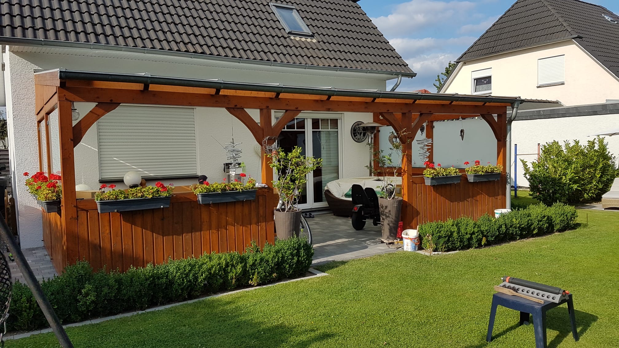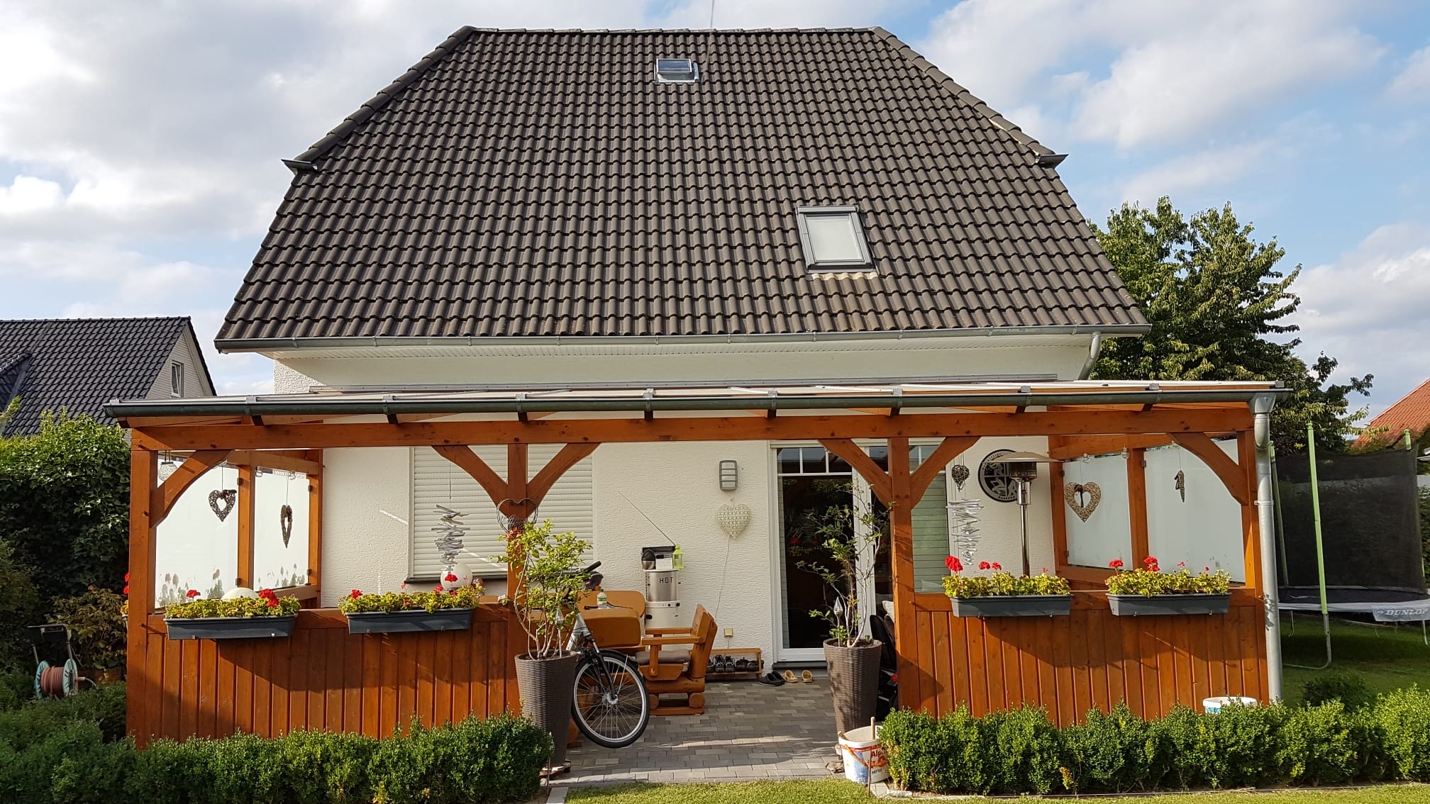 Die großzügige Terrassenüberdachung aus Holz-Leimbindern wurde mit einem Dach aus 8 mm starkem, milchigem Sicherheitsglas versehen und ist seitlich ebenfalls verglast, sodass sie optimal vor Wind und Wetter geschützt ist. So lässt sich die Gartensaison vom Frühling bis in den späten Herbst genießen. Perfekt für gemütliche Stunden mit Familie und Freunden.