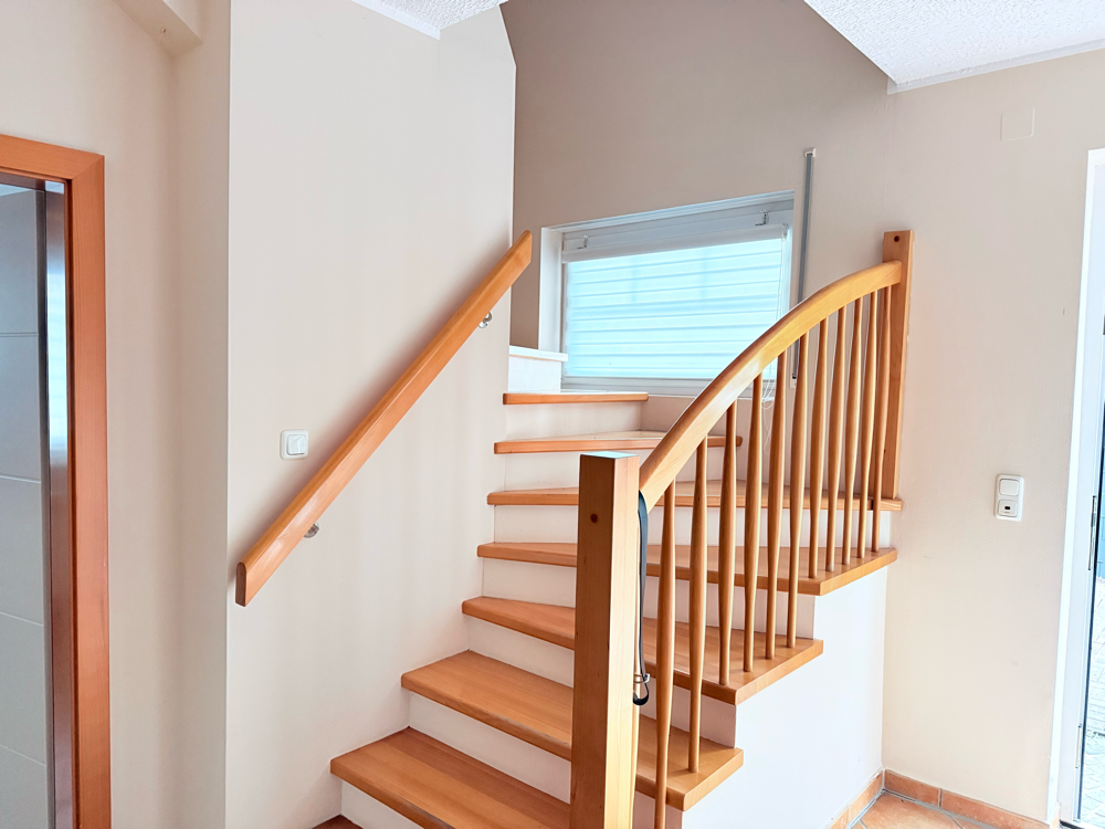 Auf der rechten Seite führt eine massive Treppe aus Beton ins Obergeschoss. Direkt im Anschluss befindet sich die moderne Einbauküche, die durch ihre nahezu umlaufende Schrankanordnung viel Stauraum und Arbeitsfläche bietet. Hier lässt sich komfortabel kochen und genießen.