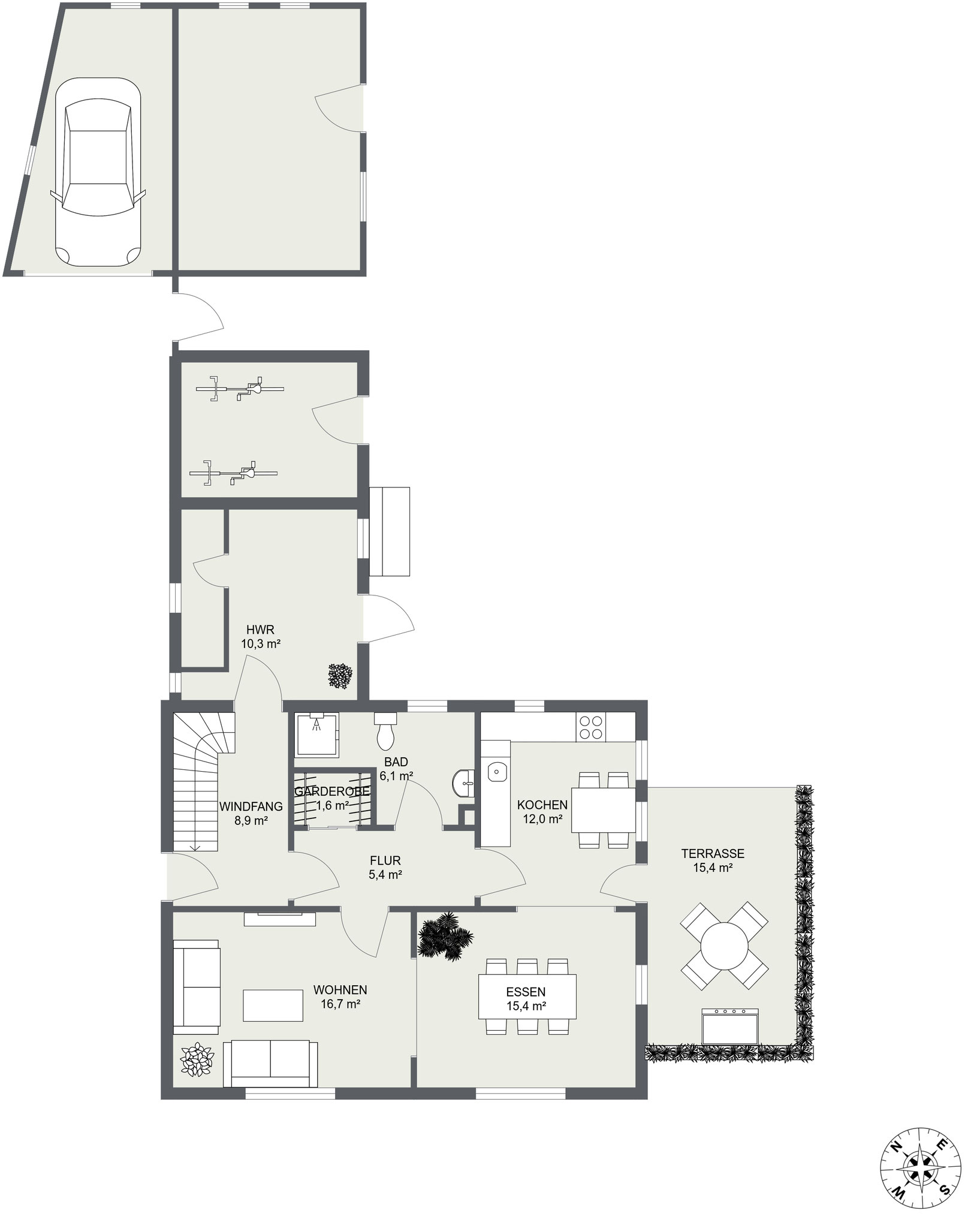 Die Terrasse liegt seitlich am Haus und bietet einen geschützten Platz zum Entspannen – ob beim Frühstück im Freien oder beim Grillabend mit Freunden. Der Vorgarten schafft dabei einen angenehmen Abstand zur Straße und rundet das stimmige Gesamtbild ab.