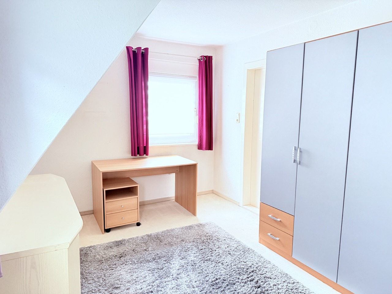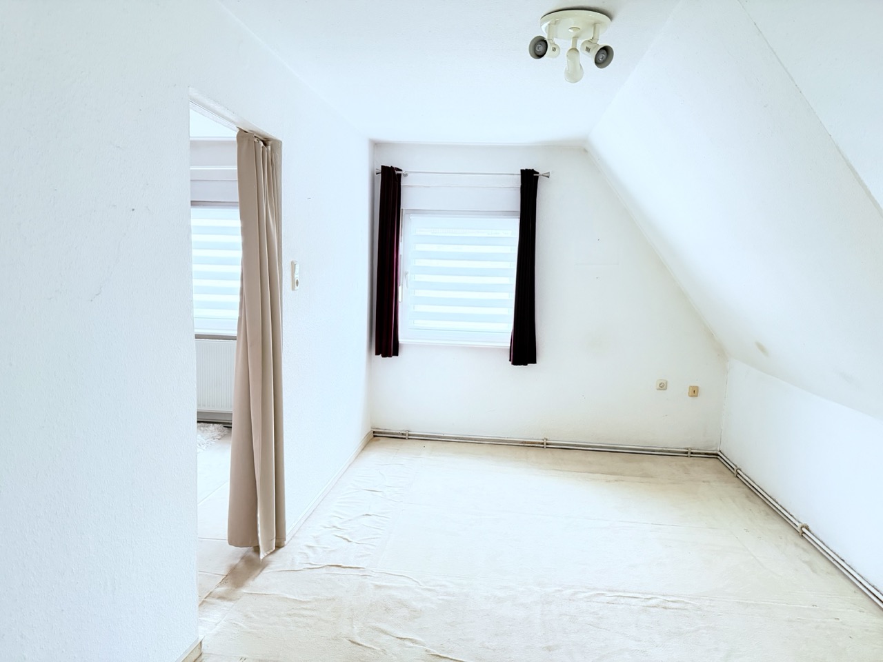 Im hinteren Bereich des Obergeschosses befindet sich ein kleineres Ankleidezimmer, das durch einen offenen Durchgang direkt mit dem geräumigen Schlafzimmer verbunden ist – eine praktische Lösung mit viel Potenzial für individuellen Komfort.