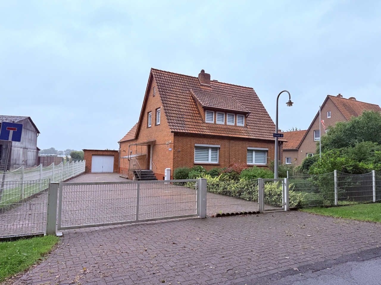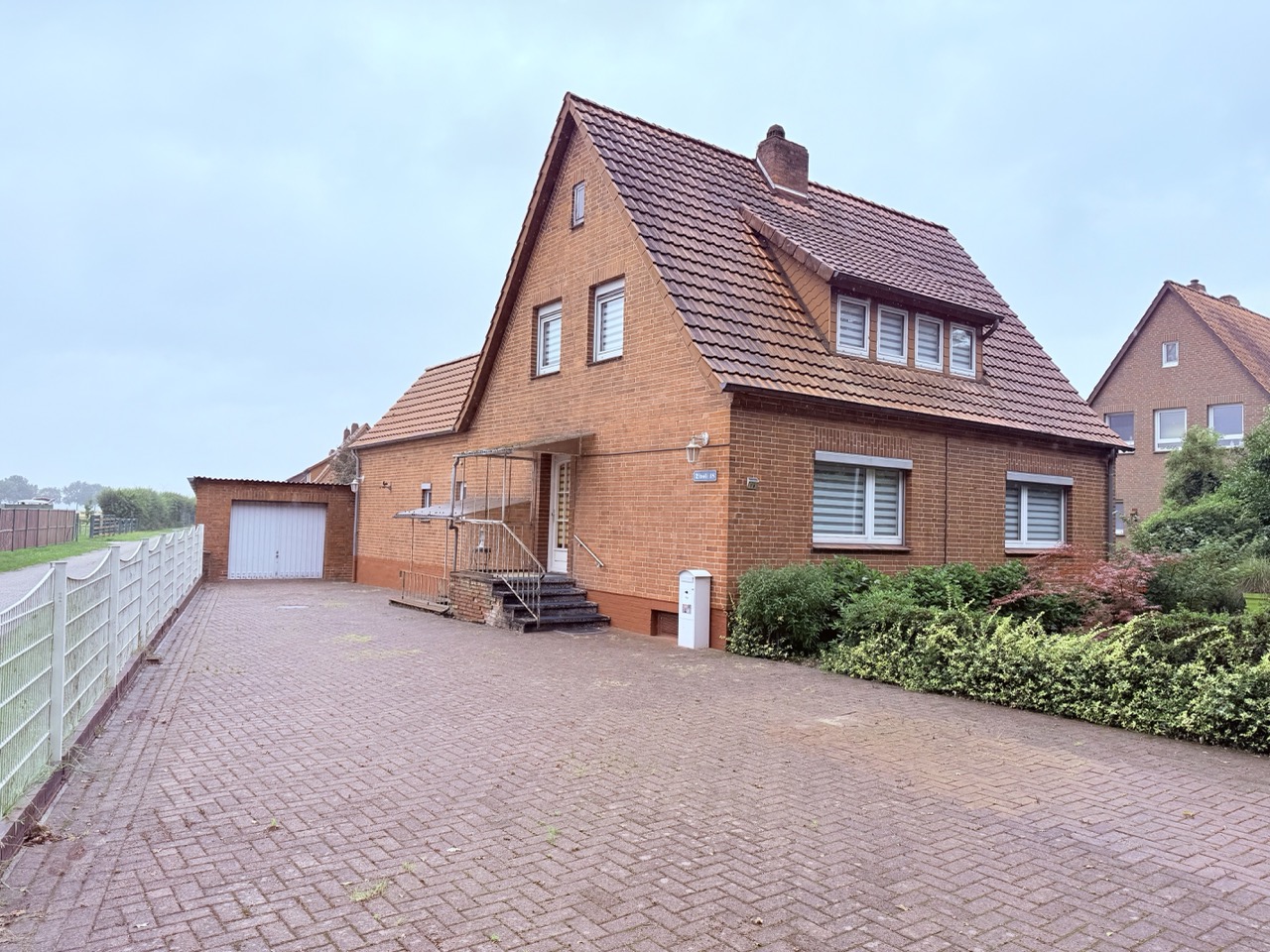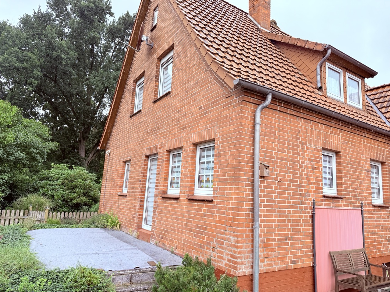 Seitlich am Giebel des Eingangsbereichs führt eine lange, gepflasterte Hofeinfahrt direkt zur Garage. Im Anschluss befindet sich eine kleine Werkstatt, die sich perfekt für Hobbyhandwerker oder als zusätzlicher Stauraum eignet.