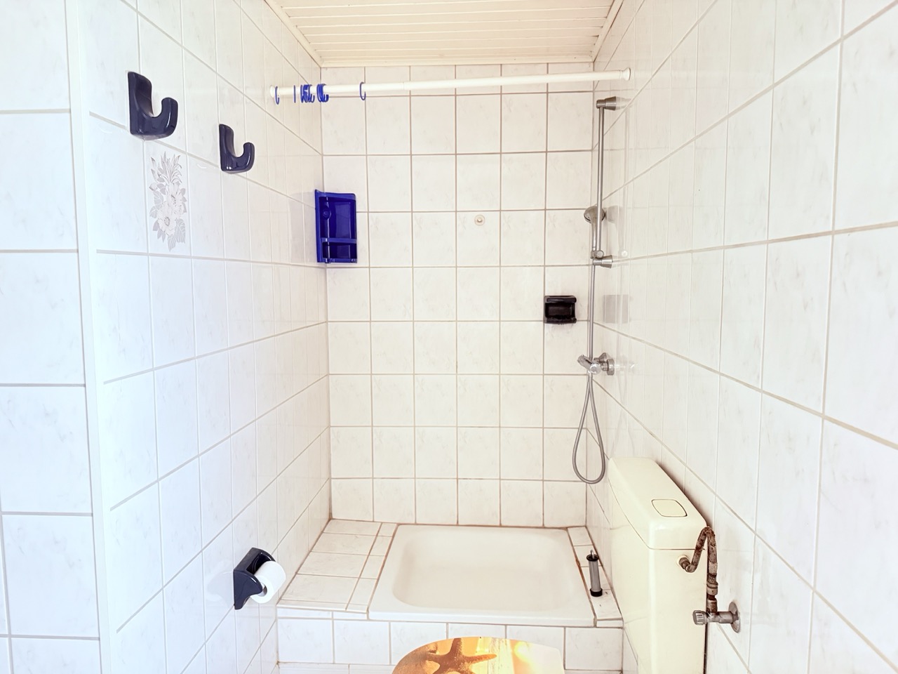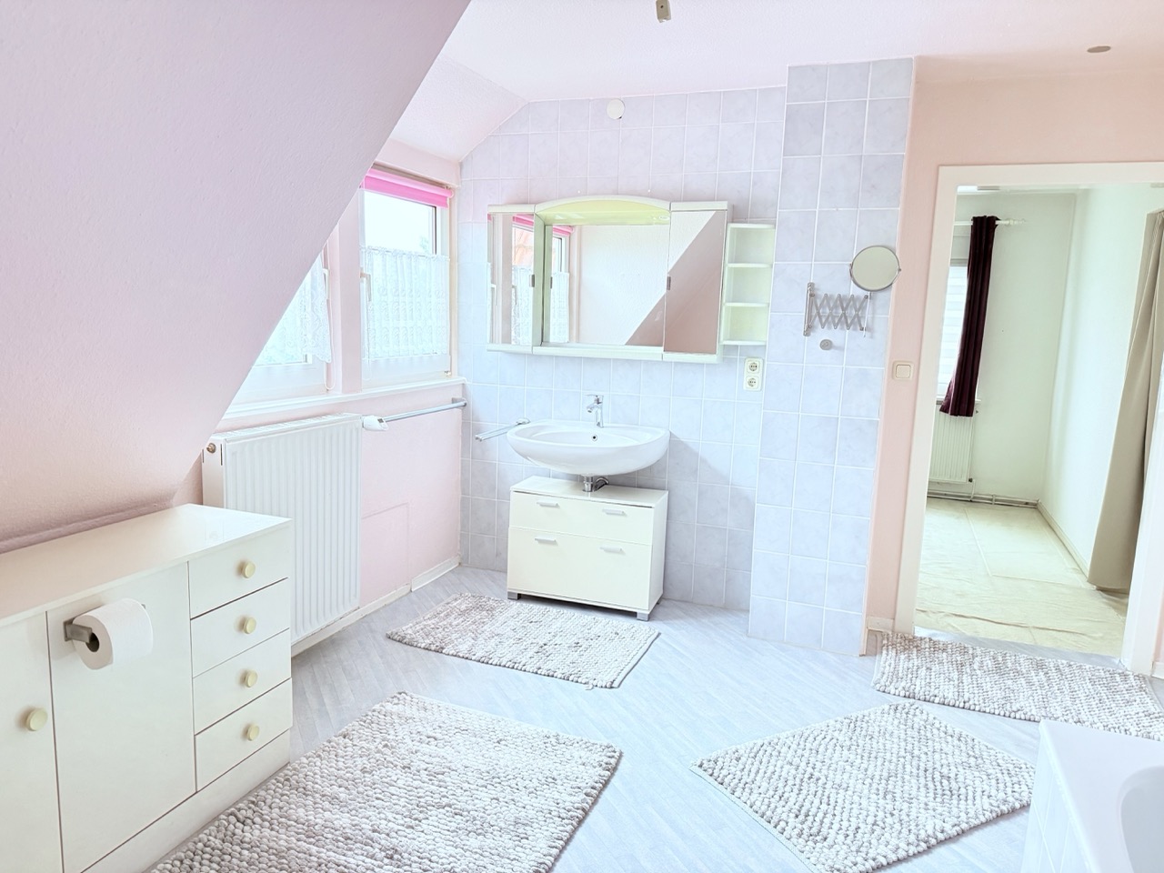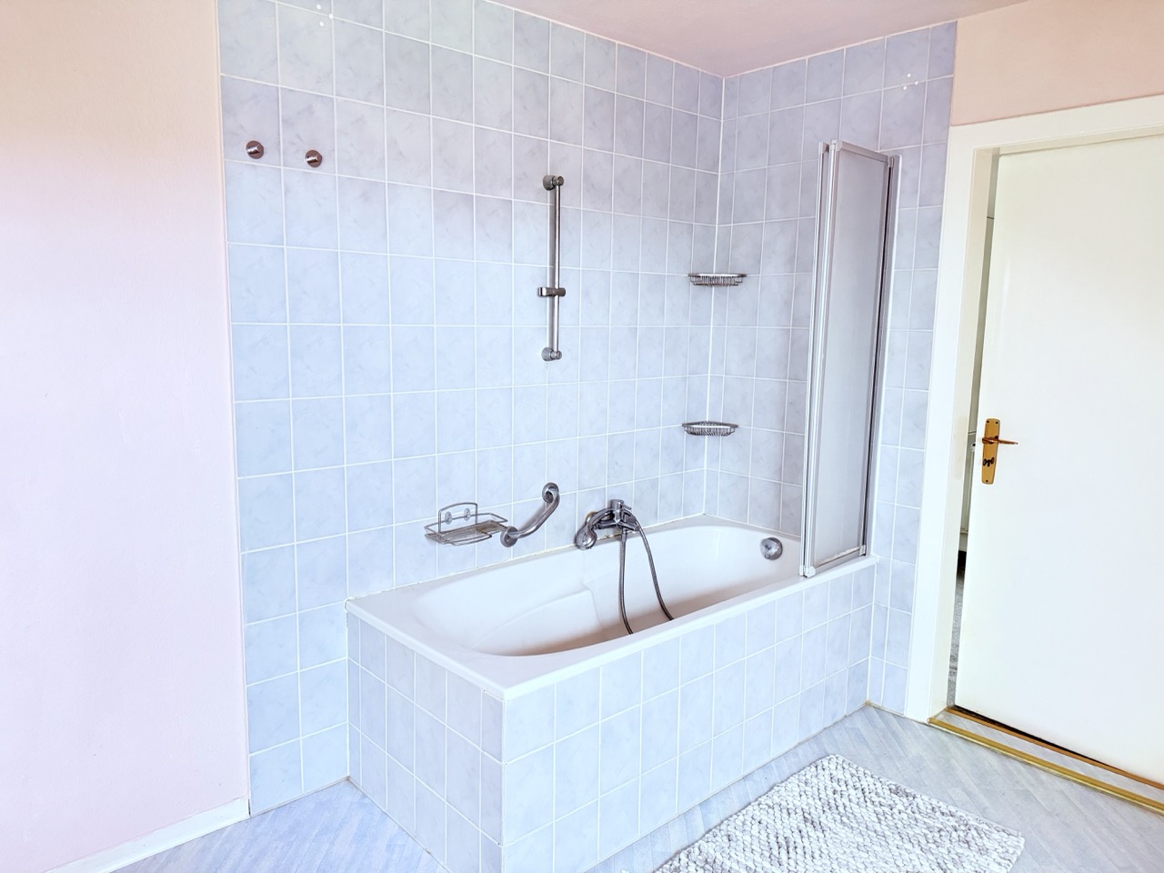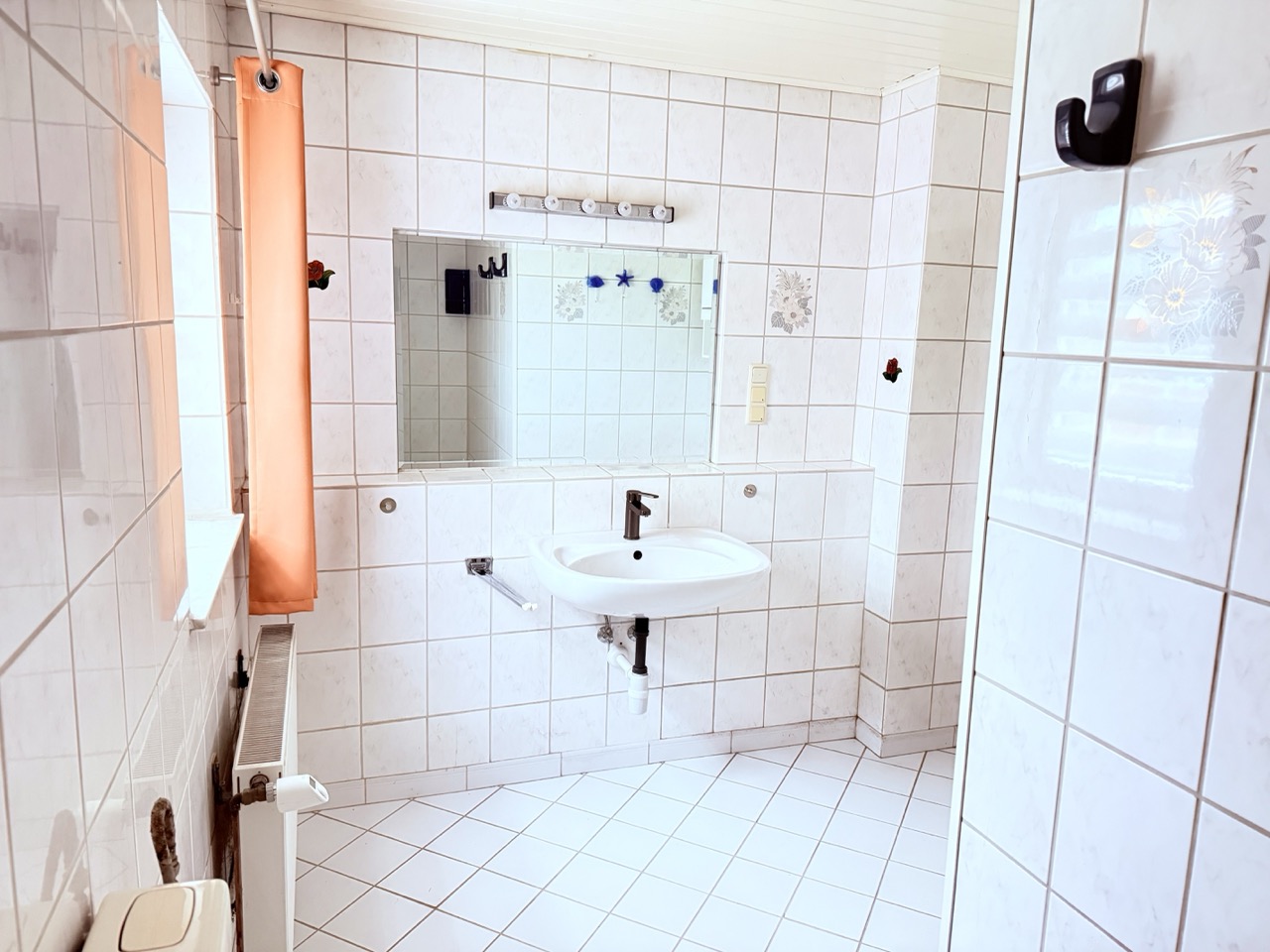 Die zweite Tür führt in das Badezimmer, das mit einer Badewanne, einem Waschtisch sowie einer Toilette ausgestattet ist. Die Ausstattung entspricht überwiegend dem Standard der 1990er Jahre und lässt sich mit wenig Aufwand modernisieren.