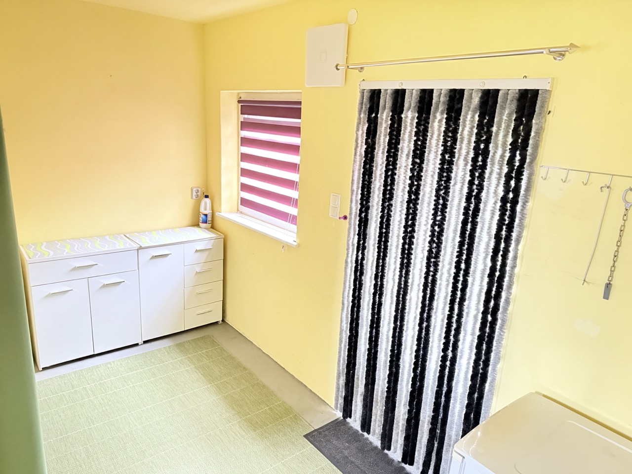 Zur linken Seite führen zwei Stufen hinab in den ehemaligen Stallbereich, der heute als praktischer Hauswirtschaftsraum genutzt wird. Dieser verfügt über einen separaten Zugang nach draußen – ideal zum Beispiel für den direkten Weg in den Garten oder zum Wäschetrocknen im Freien.
