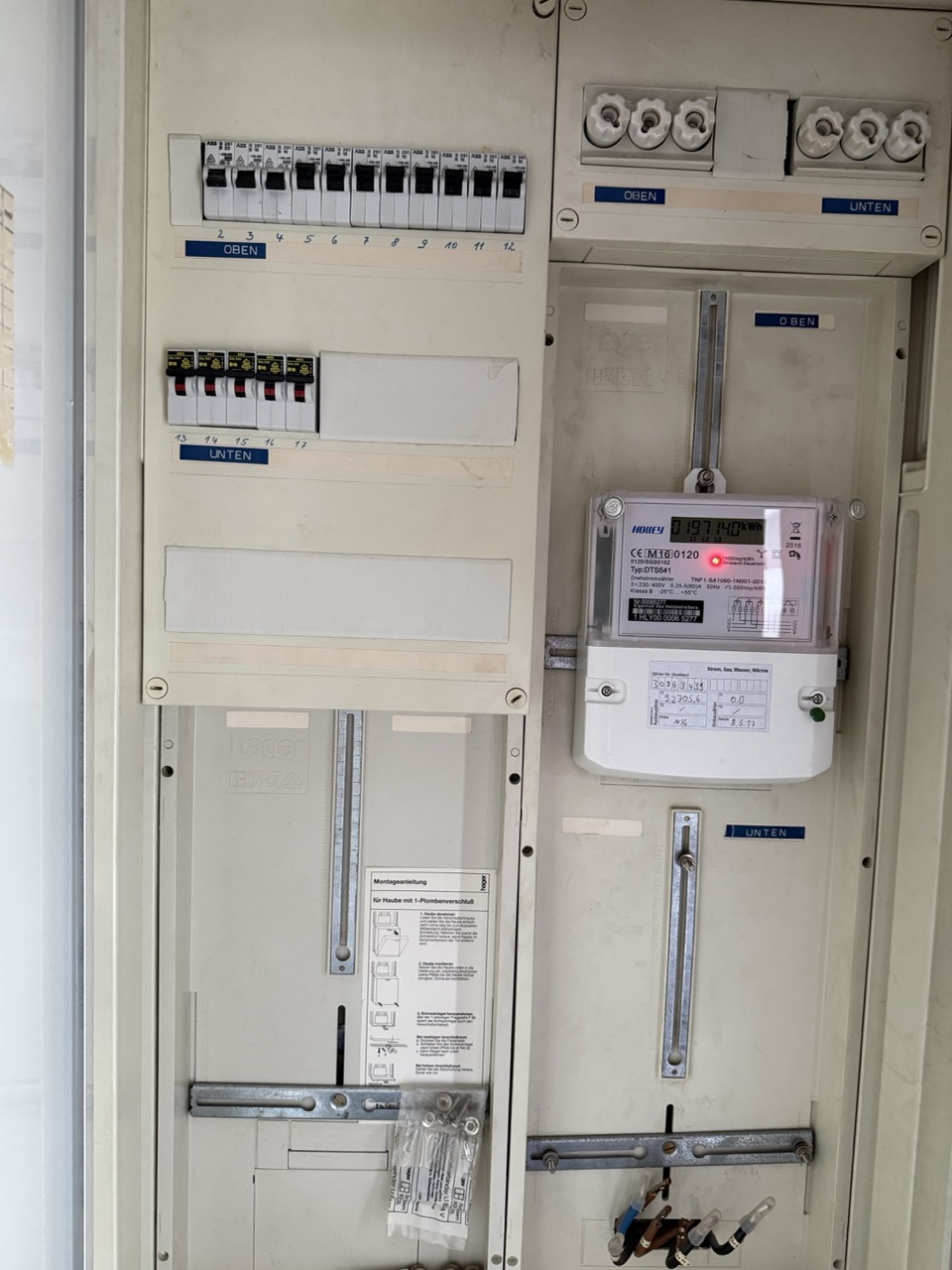 Über die geschwungene Treppe gelangt man ins Obergeschoss des Hauses. Gleich zu Beginn fällt hier der in den 1990er Jahren modernisierte Sicherungskasten mit Stromzähler ins Auge – dezent integriert und dennoch gut erreichbar.